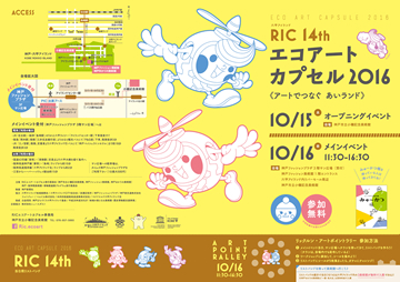 [TITLE] RIC ECO ART CAPSULE 2016@[DATE] 2016.10.16 (SUN)@[TIME] 11:30 - 16:30 (MAIN EVENT)@[PLACE] Kobe Fashion Plaza 3F / Kobe Fashion Museum 1F Entrance / River Mall (Rokko Island) / Kobe City Koiso Memorial Museum@[ARTISTS] Aki Imai / Maki Emoto / Otto / GARAFTA / Norimitsu Komaki / SHIEMIRI / Seiichi Shibata / seimani candles / Kazuya Sonoda & Miya - City / Portrait Shop "MAKAKI" / Jiro Hashimoto (ZEIT) / Tomohiro Yagi / YUME NO HAKO / RIC'n' Dancers@[REGIONAL ARTISTS BOOTH] UGANDA HOUSE / Kobe City Museum / Koyo Junior High School Art Department / Rokko Island High School "BIKEI" / Koyo Children's House / Art College Kobe / Tessy and her Friends / Next Island "Kobe Women's Junior College" / MYUKATSU™7 (Akashi City Museum of Culture / Ashiya City Museum of Art and History / Kobe Art Village Center / Hyogo Prefectural Museum of Art / BB Plaza Museum / Yokoo Tadanori Museum of Contemporary Art)@[PIC BOOTH] ECRU / someRef / Salon de bonheur / SONJON / Emiko Taya / Junko Suzuki / *nanaco* / Berets / Ma'Favori / Nana Yamada, Tomomi Ushio@[ROKKO ISLAND MUSEUMS BOOTH] Kobe City Koiso Memorial Museum / Kobe Fashion Museum / Kobe Artists Museum@[PRESENTED BY] RIC Eco Art Capsule Executive Committee (Kobe City Koiso Memorial Museum, Kobe Fashion Museum, Kobe Artists Museum) / Between Kobe and Hanshin Museums Cooperation Program Executive Committee@[URL] http://on.fb.me/1L8pLGO