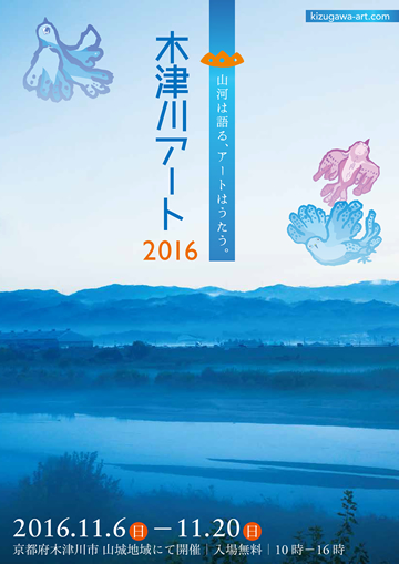 [TITLE] Kizugawa Art 2016@[THEME] Life@[DURATION] 2016.11.06 (SUN) - 11.20 (SUN) 10:00 - 16:00@[FEE] FREE@[VENUES] Yamashiro-cho Kizugawa, Kyoto@[ARTISTS] Miyuki Asayama / Taku Ibuki / Keiji Ueshima, Ryota Yagi (Invitation) / Tei Erikusa / Akihito Okunaka / Rika Onozaki / Kazuhiro Obara / Mina Katsuki / Miyuki Kido / Norimitsu Komaki / Masakazu Kondo / Hiroko Sakaki / Jun Sato / Yuma Takaishi / Takarazuka University Shinjuku Campus Extramural Relations Office / Yohei Takenaka / Hiroki Tajika / Takehiro Tezuka, Mizue Kusaki / Gaku Nakamura / Naoko Narita / Hiroshi Niiyama + Kobe Municipal High School of Science and Technology / nisai¨ Nobuo Kumagai / Jiro Hashimoto / Masahiro Hasegawa (Invitation) / Miyuki Hanamoto / Tadashi Hayashi / Naoko Fukao / Yoko Fujitomo / Yume Matsui / Kayano Morimoto / Shigeru Yamamoto / ROKUICHI@[ORGANIZERS] Kizugawa Art Project@[URL] http://kizugawa-art.com