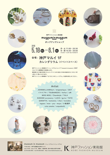[TITLE] Kobe Fashion Museum@museum in museum@pop-up shop@[DATE] 2016.05.18 (WED) - 06.01 (WED)@[TIME] 11:00 - 20:30 (MON - SAT) 10:30 - 20:00 (SUN, HOLIDAY) -21:00 (5/25 - 5/31)@[PLACE] KOBE MARUI 1F CALENDARIUM (EVENT SPACE) http://www.0101.co.jp/stores/guide/store830.html@[ARTIST] JOHNWILLIAMHart / énigmatique / ZEIT / Aki Imai / TSUBAMEDO / itofun / uM / MOG MOG / Chandelyk / TALA / KARASKI accessory / LUCO / ga.la / TATO / GARAFTA / motomio / rihei / invisible / logsee / monEyouEmoyo / Ai Kojima / coia canata / coquebotti@[URL] http://www.fashionmuseum.or.jp/shop