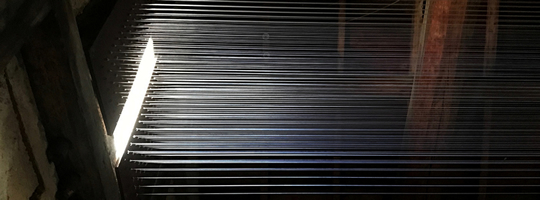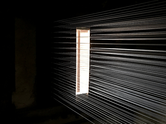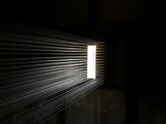 自然の光や風を取り込んだインスタレーション作品。糸を素材に用い、そこに自然の光を反映させることで、光の束が現れます。その表情は天候や時間によって微妙な変化を見せます。時折吹く風は、音(風鈴)となって鑑賞者の耳に届きます。「風の通り道」は、自然の光や風、そして時間の経過を感じさせる作品です。